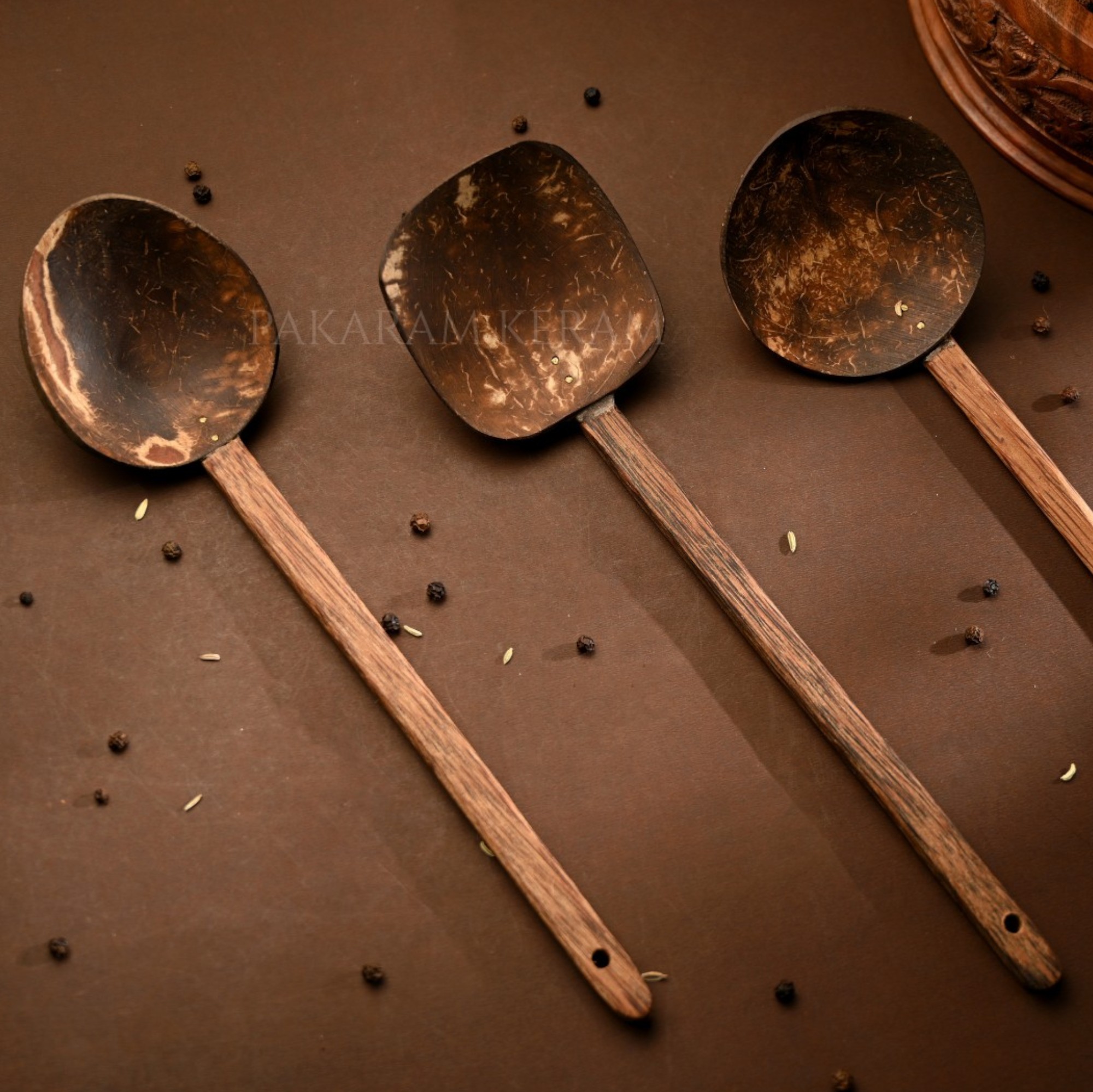 Pakaram Keram Coconut Shell Serving Set of 3- Round, Square Like and Leaf Shaped Spoons