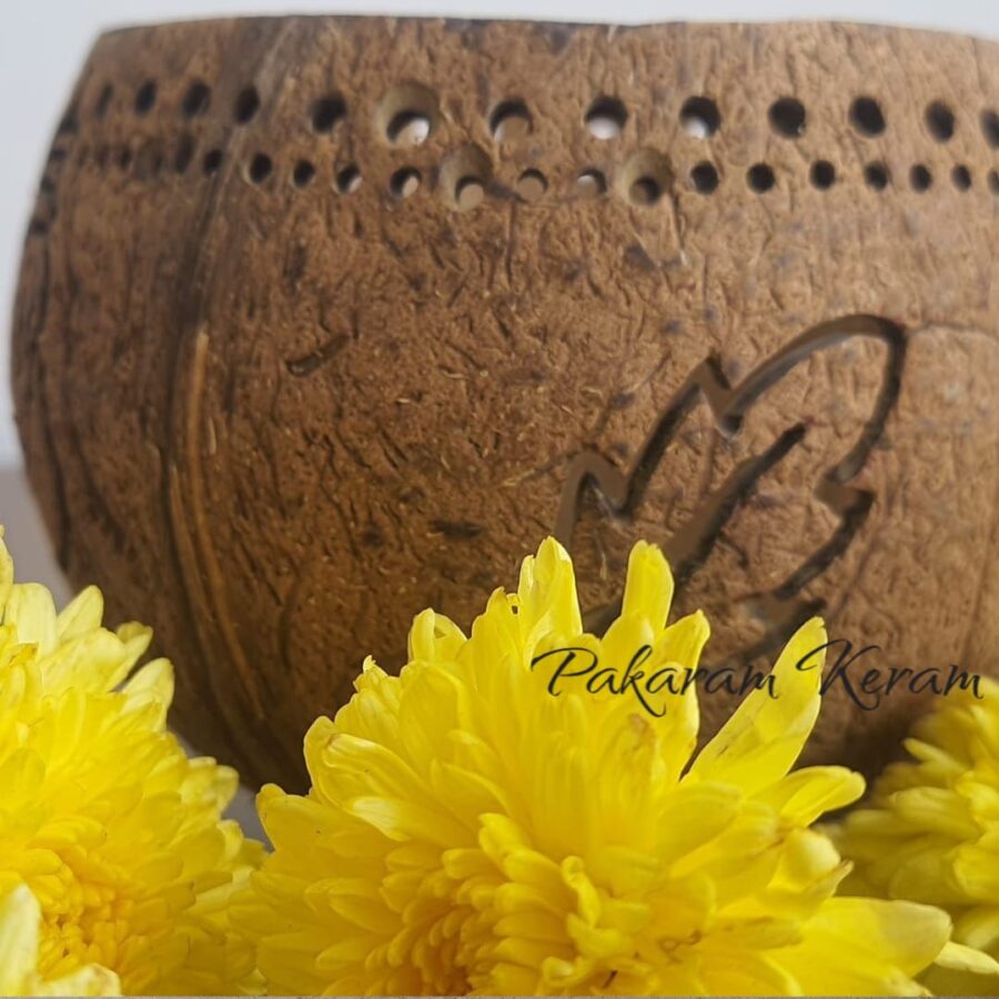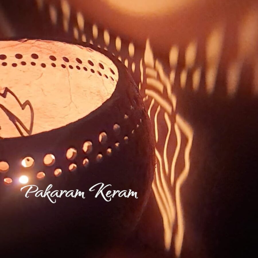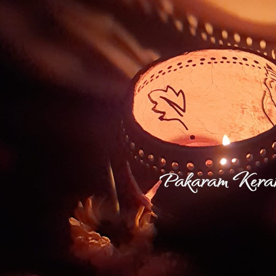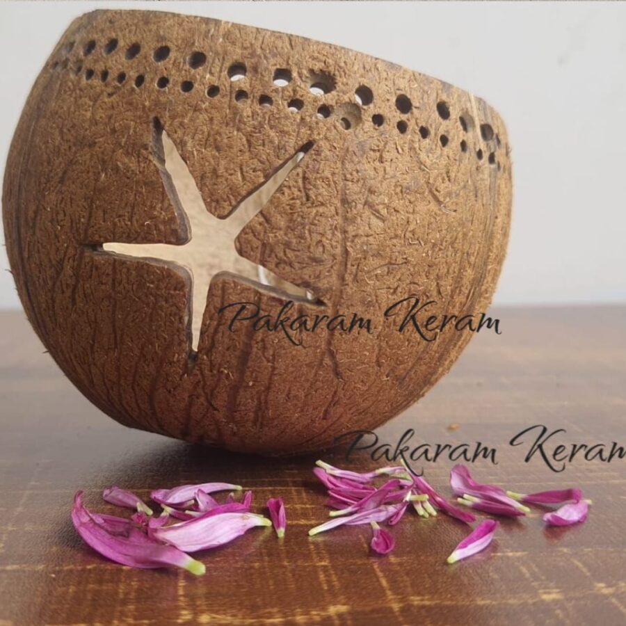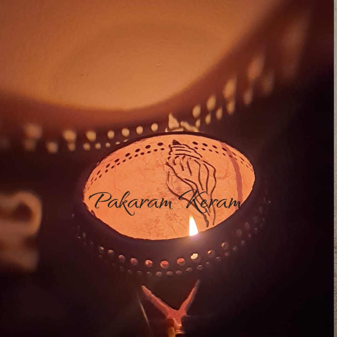 This beautiful diya/candle holder captures the natural texture of coconut shell combined with the essence of marine life. It resembles a coral reef providing habitat to an echoing conch shell, a radiating starfish and a curved tropical leaf .