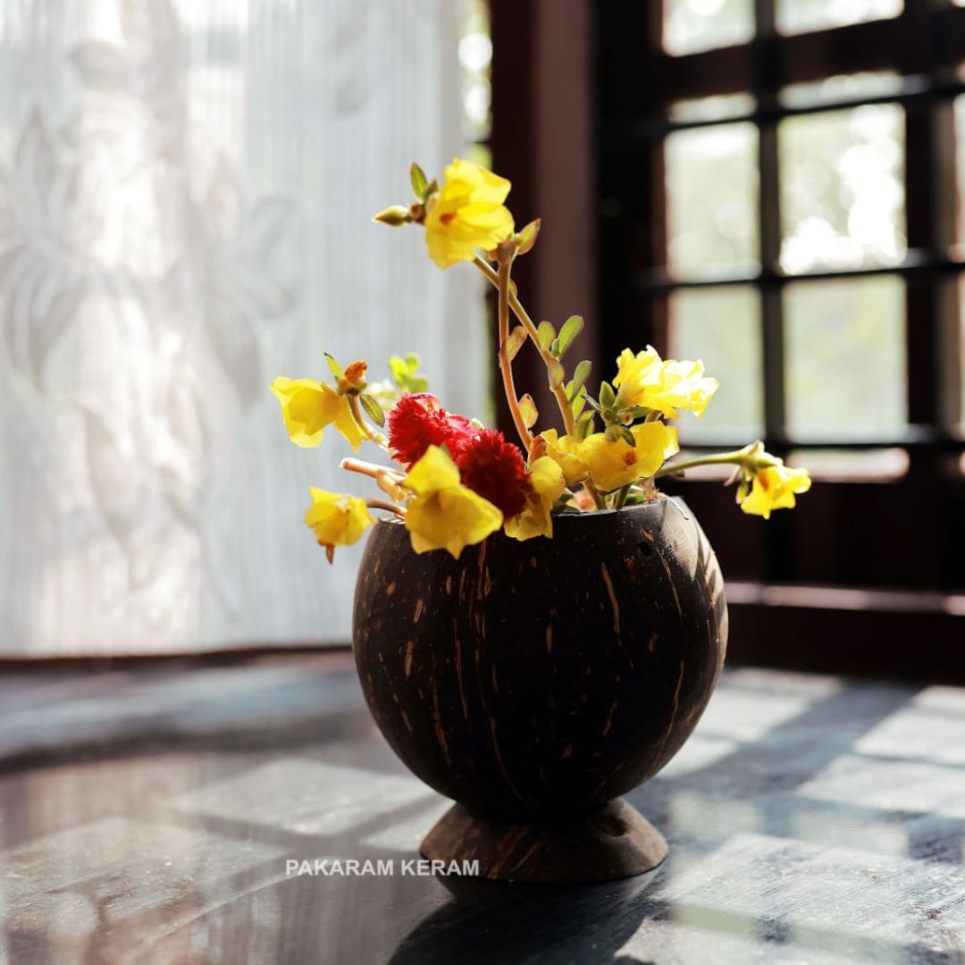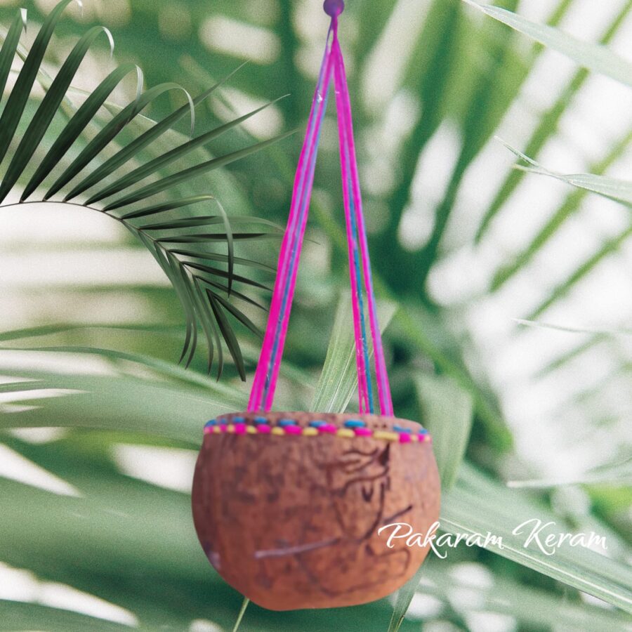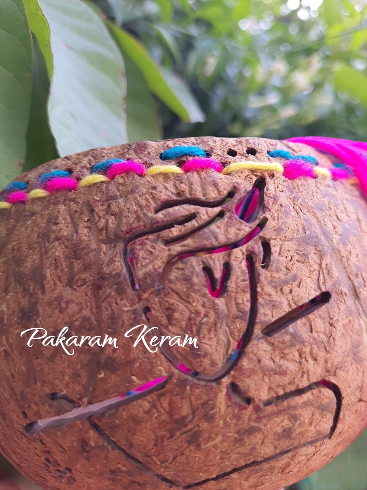 This art piece made from coconut shell, holds a carving of Lord Krishna and resembles the butter pot hung from the ceilings in the peaceful village of Gokul. These earthen pots also called as Uri in Malayalam, which is an Indian language, were used to store freshly made butter. The butter pot was considered not as just a vessel, but a depiction of daily devotion.